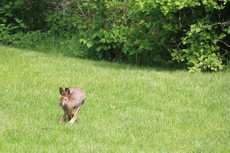 My experience is that most people think that the hare that left the tracks in the photo was travelling south. The two prints that are next to each other at the top of the photo are the back feet so south seems like a logical guess. But, when a hare runs its hind feet actually land in front of its front feet, as in the photo below.